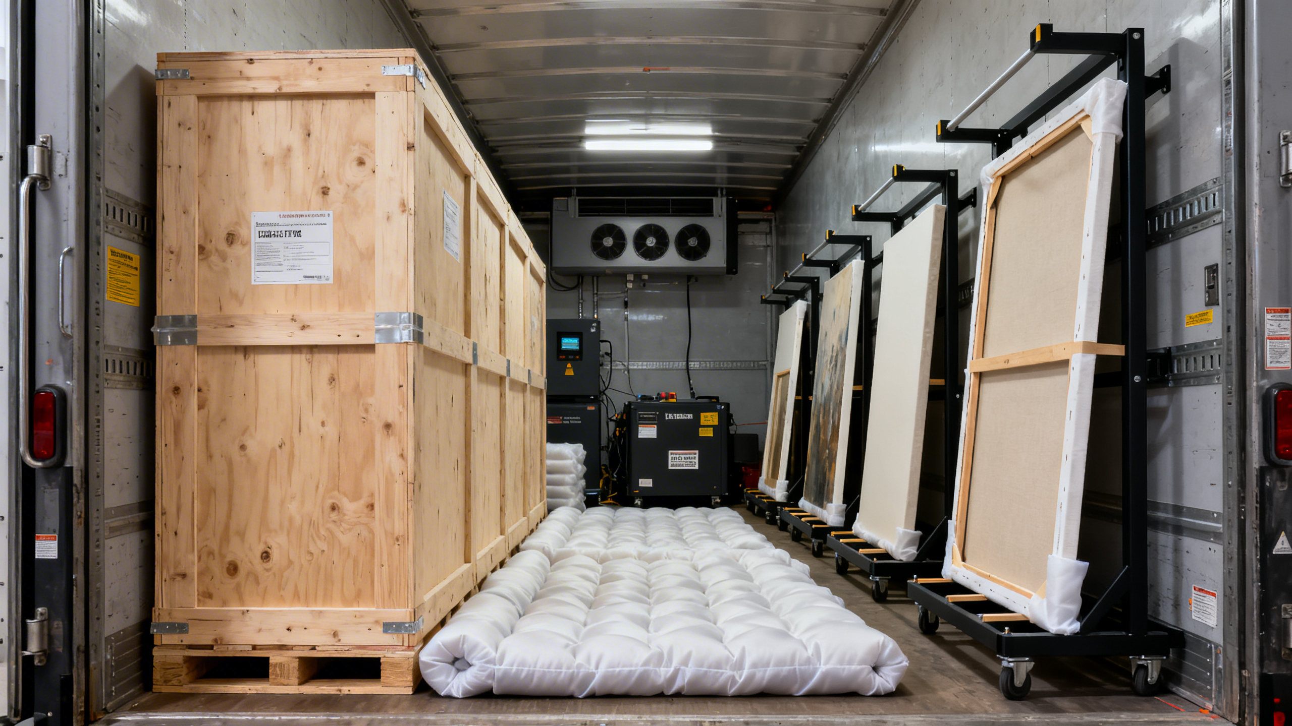 C’est probablement l’étape la plus déterminante. Les matériaux ne sont pas choisis au hasard : mousses à pH neutre, caisses en contreplaqué renforcé, films anti-UV, amortisseurs de vibration. Pour les pièces les plus fragiles, des caisses climatisées maintiennent température et humidité stables pendant tout le trajet — parce que la dilatation et la contraction des matières font autant de dégâts qu’un choc.